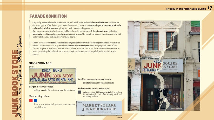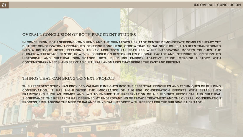 In this individual precedent study, we were required to analyze two different heritage buildings to examine their methods and processes for conserving facades. So I choose Chinatown Heritage Center, Singapore and Sekeping Kong Heng, Ipoh. This helped us gain a foundational understanding of the sequence of conservation steps and techniques. Additionally, it provided valuable insights that made it easier to approach and understand the requirements of Assignment 2.